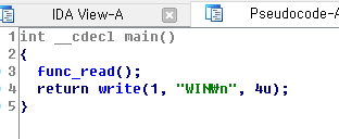 func_read()라는 제가 임의로 이름지은 함수가 실행되고 write함수로 WIN을 띄워줍니다.
