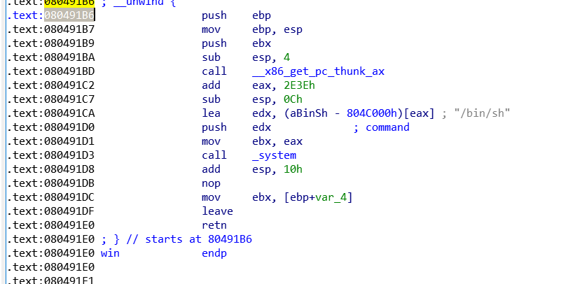 win() 함수에는 binsh를 띄우는 system함수가 있네요. 그럼 이제 ret 주소를 win()의 주소로 바꾸면 되겠습니다.