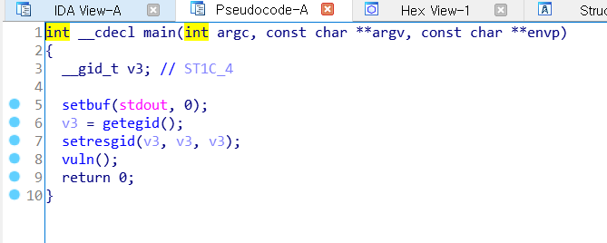 main() 함수 안에 vuln()이라는 함수가 있고,
