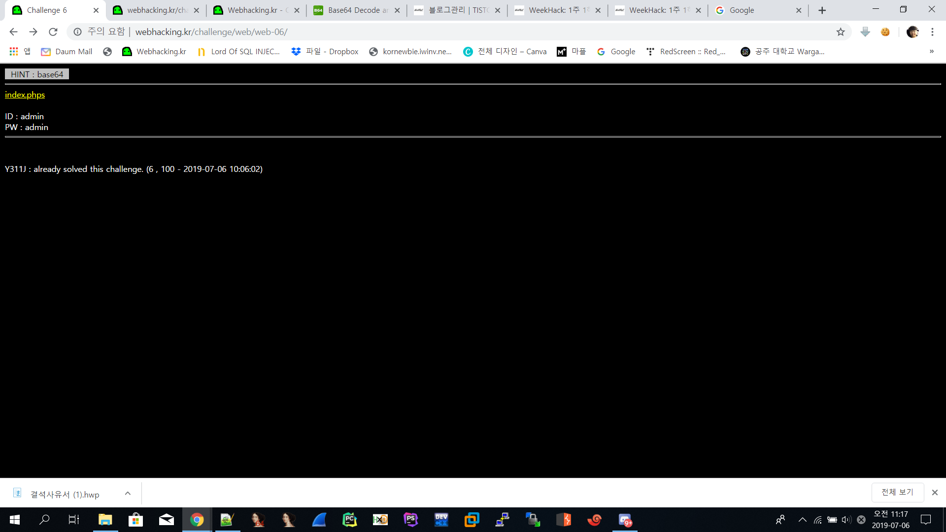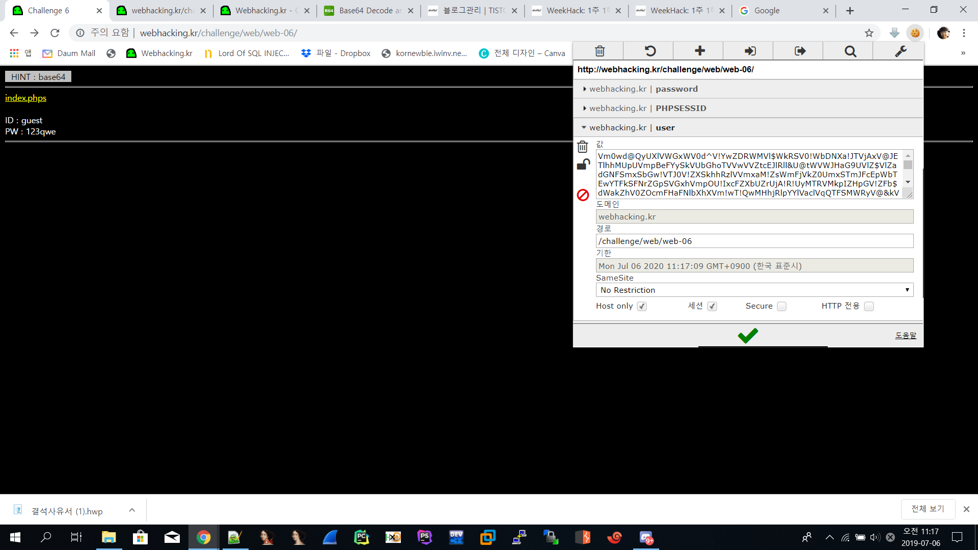 <?php if(!$_COOKIE[user]) { $val_id="guest"; $val_pw="123qwe"; for($i=0;$i<20;$i++) { $val_id=base64_encode($val_id); $val_pw=base64_encode($val_pw); } $val_id=str_replace("1","!",$val_id); $val_id=str_replace("2","@",$val_id); $val_id=str_replace("3","$",$val_id); $val_id=str_replace("4","^",$val_id); $val_id=str_replace("5","&",$val_id); $val_id=str_replace("6","*",$val_id); $val_id=str_replace("7","(",$val_id); $val_id=str_replace("8",")",$val_id); $val_pw=str_replace("1","!",$val_pw); $val_pw=str_replace("2","@",$val_pw); $val_pw=str_replace("3","$",$val_pw); $val_pw=str_replace("4","^",$val_pw); $val_pw=str_replace("5","&",$val_pw); $val_pw=str_replace("6","*",$val_pw); $val_pw=str_replace("7","(",$val_pw); $val_pw=str_replace("8",")",$val_pw); Setcookie("user",$val_id); Setcookie("password",$val_pw); echo("<meta http-equiv=refresh content=0>"); } ?> <html> <head> <title>Challenge 6</title> <style type="text/css"> body { background:black; color:white; font-size:10pt; } </style> </head> <body> <? $decode_id=$_COOKIE[user]; $decode_pw=$_COOKIE[password]; $decode_id=str_replace("!","1",$decode_id); $decode_id=str_replace("@","2",$decode_id); $decode_id=str_replace("$","3",$decode_id); $decode_id=str_replace("^","4",$decode_id); $decode_id=str_replace("&","5",$decode_id); $decode_id=str_replace("*","6",$decode_id); $decode_id=str_replace("(","7",$decode_id); $decode_id=str_replace(")","8",$decode_id); $decode_pw=str_replace("!","1",$decode_pw); $decode_pw=str_replace("@","2",$decode_pw); $decode_pw=str_replace("$","3",$decode_pw); $decode_pw=str_replace("^","4",$decode_pw); $decode_pw=str_replace("&","5",$decode_pw); $decode_pw=str_replace("*","6",$decode_pw); $decode_pw=str_replace("(","7",$decode_pw); $decode_pw=str_replace(")","8",$decode_pw); for($i=0;$i<20;$i++) { $decode_id=base64_decode($decode_id); $decode_pw=base64_decode($decode_pw); } echo("<font style=background:silver;color:black> HINT : base64 </font><hr><a href=index.phps style=color:yellow;>index.phps</a><br><br>"); echo("ID : $decode_id<br>PW : $decode_pw<hr>"); if($decode_id=="admin" && $decode_pw=="admin") { @solve(6,100); } ?> </body> </html>이렇다고 합니다. 대충 분석해보면 쿠키에 있는 id와 pw를 각각 위의 조건과 같이 replace하고 decode를 20번 합니다.