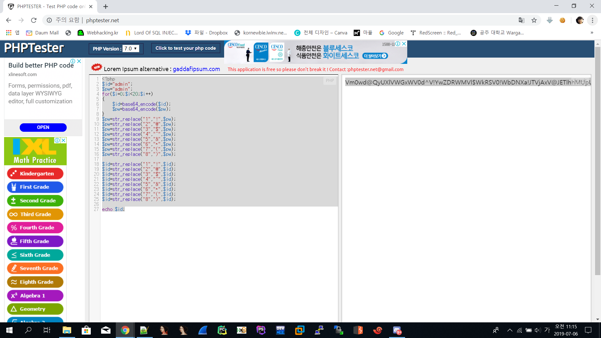 <?php $id="admin"; $pw="admin"; for($i=0;$i<20;$i++) { $id=base64_encode($id); $pw=base64_encode($pw); } $pw=str_replace("1","!",$pw); $pw=str_replace("2","@",$pw); $pw=str_replace("3","$",$pw); $pw=str_replace("4","^",$pw); $pw=str_replace("5","&",$pw); $pw=str_replace("6","*",$pw); $pw=str_replace("7","(",$pw); $pw=str_replace("8",")",$pw); $id=str_replace("1","!",$id); $id=str_replace("2","@",$id); $id=str_replace("3","$",$id); $id=str_replace("4","^",$id); $id=str_replace("5","&",$id); $id=str_replace("6","*",$id); $id=str_replace("7","(",$id); $id=str_replace("8",")",$id); echo $id;이 소스를 php를 돌려주는 웹에서 돌려봤습니다.