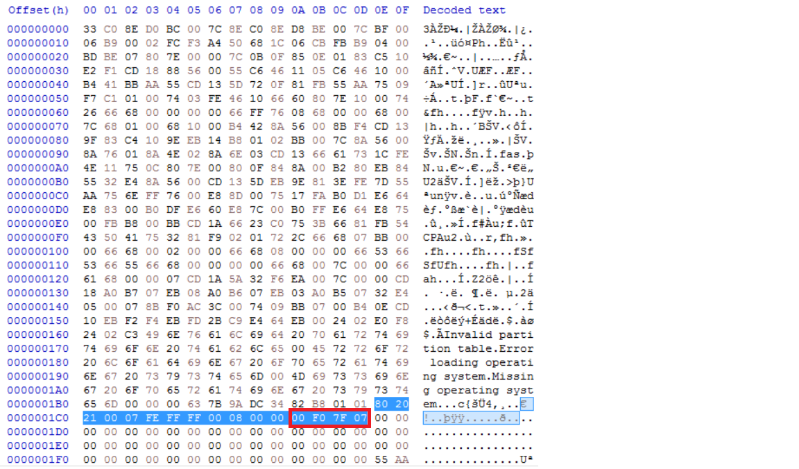 CHS주소지정방식에서 해당 파티션의 끝 6 ~ 8번째 바이트는 CHS주소지정방식에서 해당 파티션의 끝을 나타냅니다. 현재 해당 파티션의 CHS 끝 주소는 0xFFFFFE입니다.