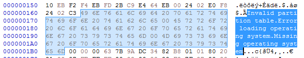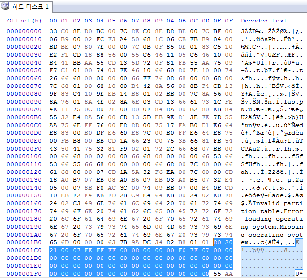 부트코드 영역 부트코드는 말 그대로 부팅을 하기 위한 코드입니다. 파티션 중 부팅이 가능한 파티션을 찾아 해당 파티션의 부트섹터로 넘겨주는 일을 합니다. 부팅 가능한 파티션을 찾지 못해 에러가 발생될 경우에는,