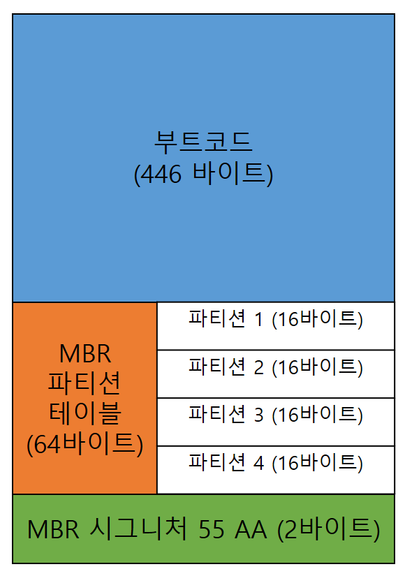 MBR의 구조 MBR의 구조는 차례대로 부트 코드(446바이트), 파티션테이블(16*4 = 64바이트), MBR시그니처(0x55 0xAA, 2바이트)로 이루어져 있습니다.