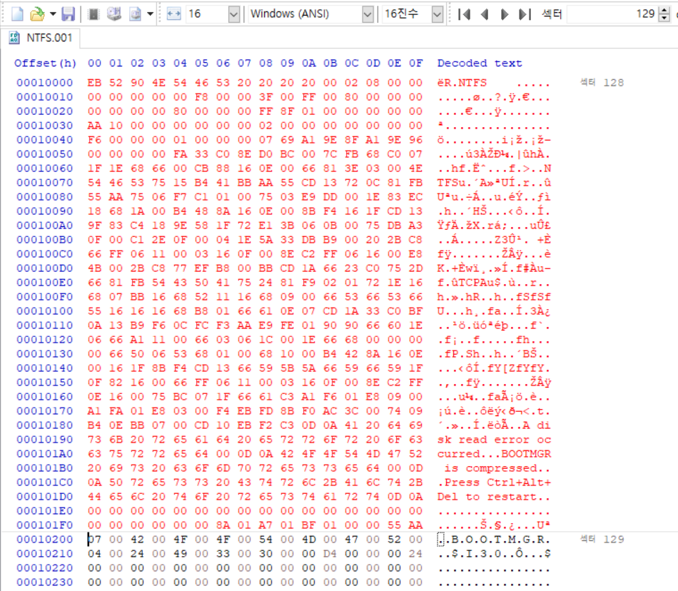 또, LBA 주소 지정방식에 따라 해당 파티션의 시작 섹터는 0x00000080 즉, 128섹터 부터 시작인 것 같습니다. NTFS의 처음 부분은 VBR이므로, 해당 파티션의 VBR 주소의 시작은 128섹터 부터라는 것도 역시 알 수 있죠.