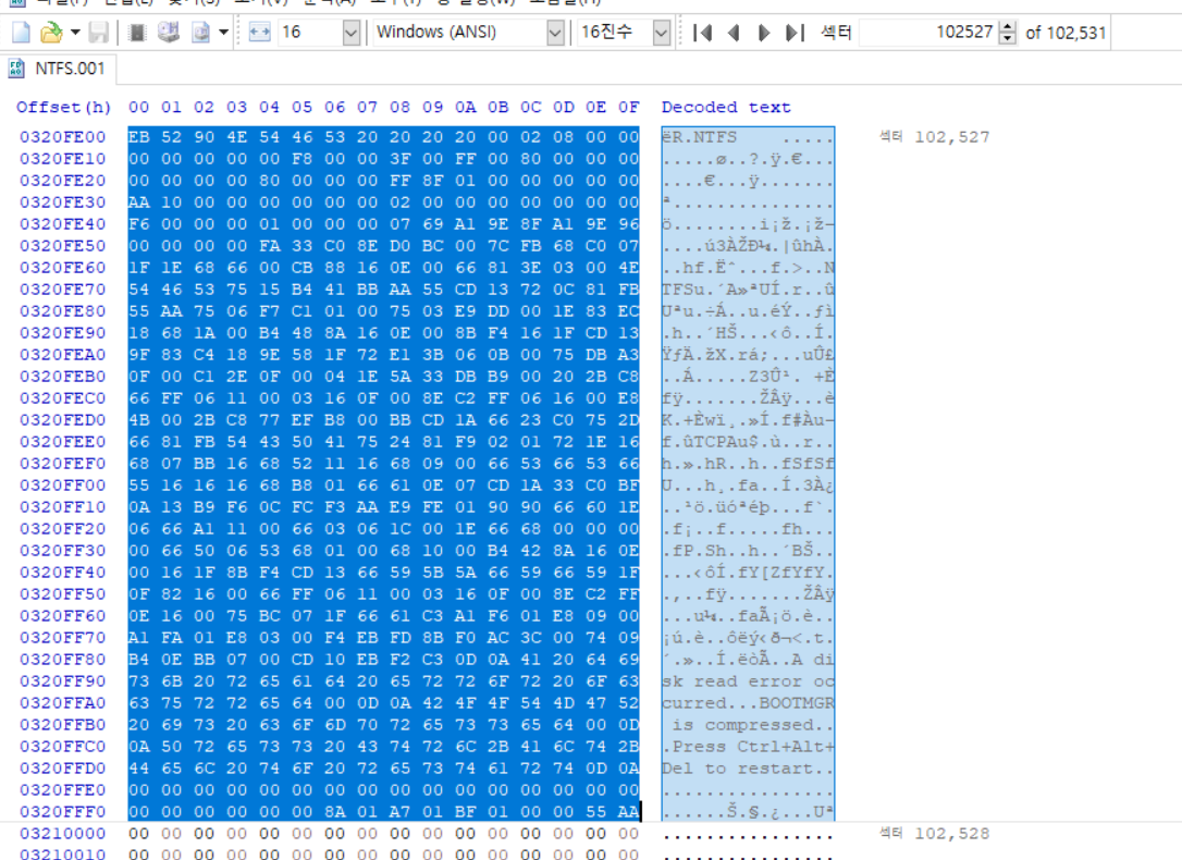 짜잔~ VBR의 사본이 존재합니다 VBR의 사본이 해당 파티션의 마지막 섹터였던 102527 섹터에 존재했습니다. 그럼 우리는 이를 어떻게 해야할까요?