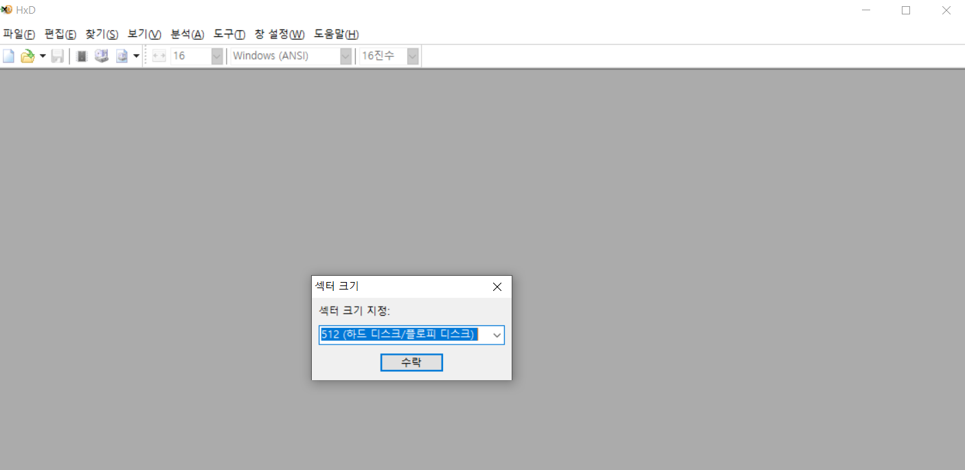 Hxd에서는 디스크 이미지 열기 기능(이미지 파일을 섹터로 나누어서 표시해줍니다.)을 제공하기에, 보편적으로 쓰이는 섹터 크기인 512를 섹터 크기로 지정해 파일을 열어보았습니다.