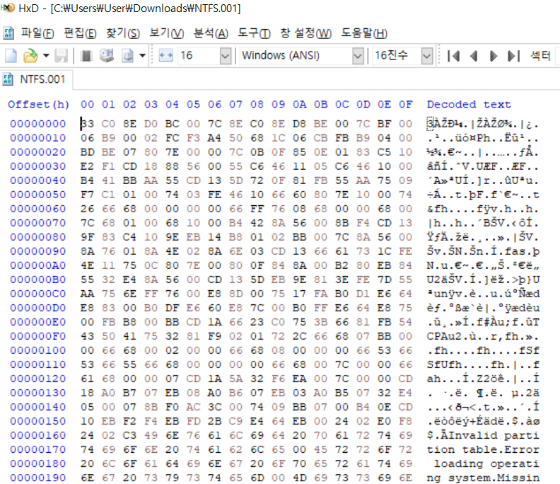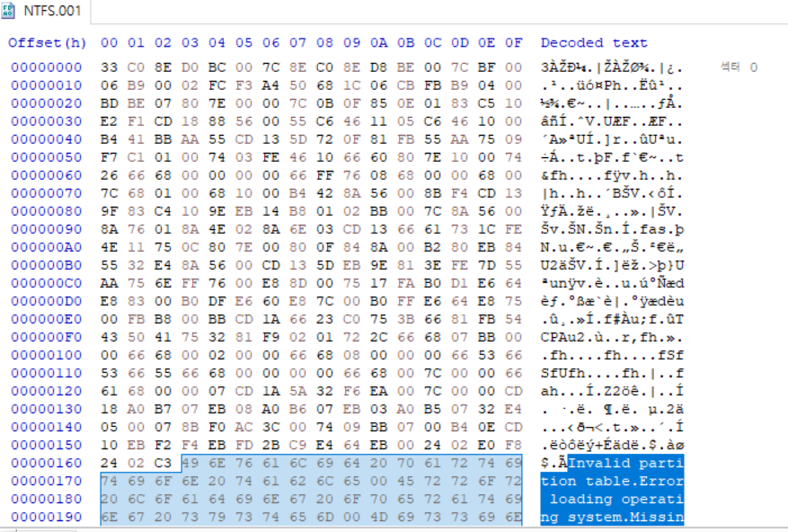 MBR 부트코드의 에러메시지 네 예전에 분석했었던(https://weekhack.tistory.com/43) MBR의 부트코드 영역의 에러메시지가 보입니다. 이로 미루어 보아 해당 이미지는 논리적 파티션을 이미징한 것이 아닌, 물리적 디스크를 이미징 한 것으로 알 수 있을 것 같습니다.