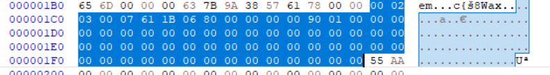 그럼 먼저 첫 부분인 0섹터부터 한 번 살펴보도록 하겠습니다. 0섹터에는 뭔가 친숙한 문구가 보이지 않나요?