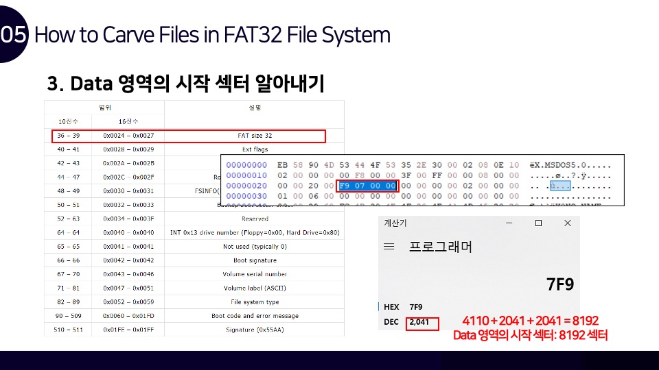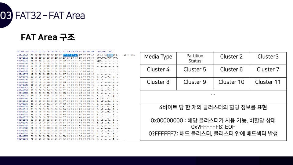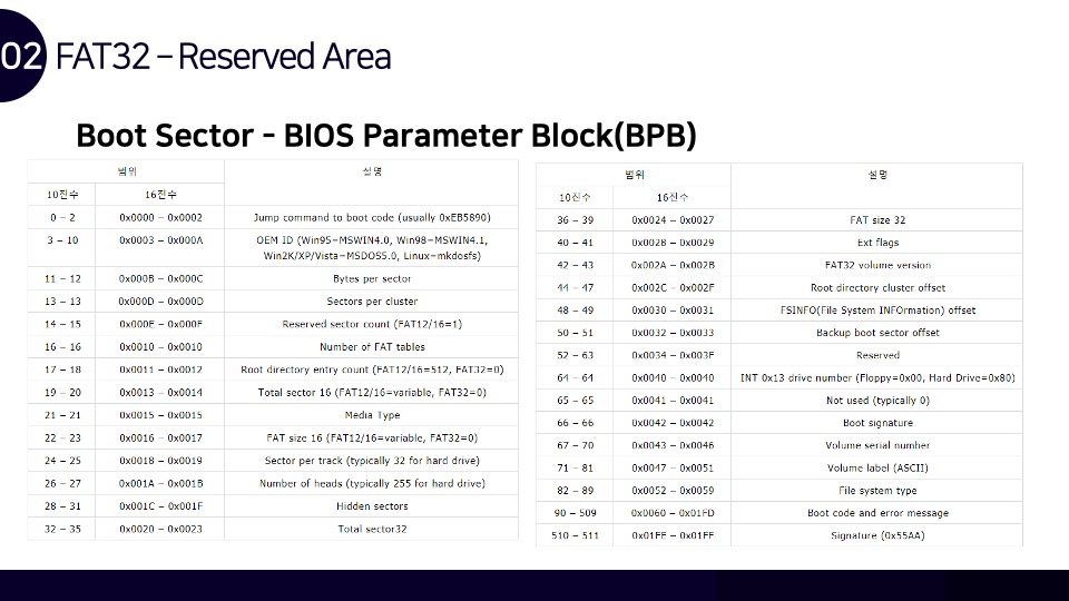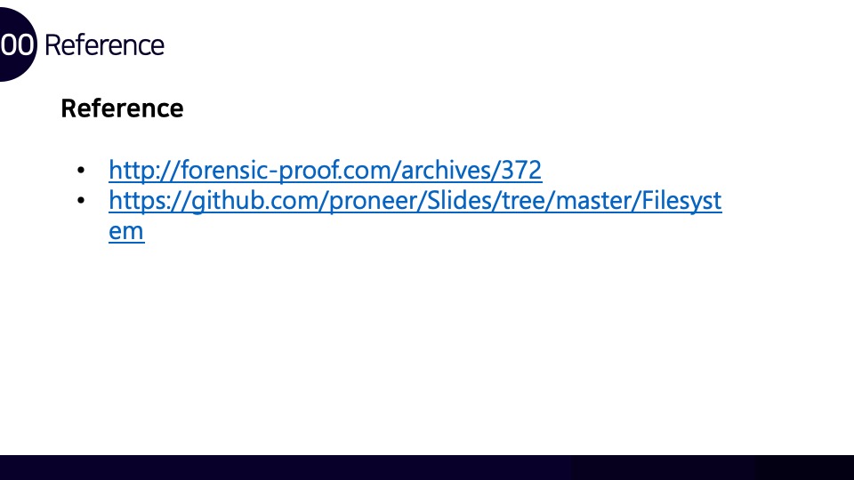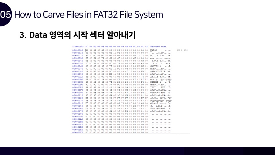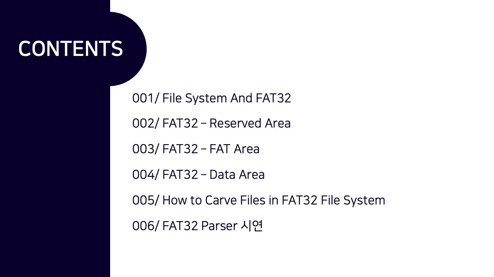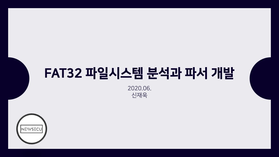 안녕하세요. Luke입니다. FAT32 파일시스템 구조와 카빙에 관하여 Newsecu에서 발표했던 발표자료를 블로그에 함께 공유합니다. 해당 발표자료를 통해 FAT32 파일시스템이 어떻게 동작하며, 어떤 방식으로 파일을 저장하는지를 확인할 수 있으며 이러한 원리를 통해 어떻게 파일 카빙(복구)이 이루어지는지를 확인할 수 있습니다. BoB 디지털 포렌식 트랙을 준비하며 파일시스템 공부를 했었을 때 만들었던 자료인데 오랫동안 공개하는 것을 잊고 있었네요. 추가적으로 앞으로의 간단한 계획을 말씀드라자면 디지털 포렌식 파트의 NTFS 시리즈도 조만간 마무리를 할 계획을 가지고 있으며, 시스템 해킹 분야의 글인 ARM 시리즈는 오랜 시간을 두고 글을 작성할 계획입니다.